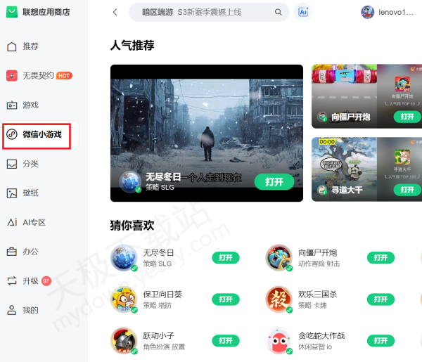 1.下载并打开最新版本的联想应用商店,点击左侧【微信小游戏】,选择喜欢的游戏。