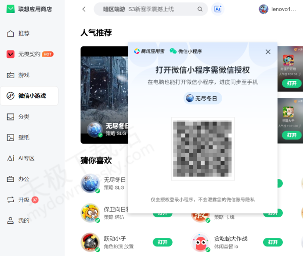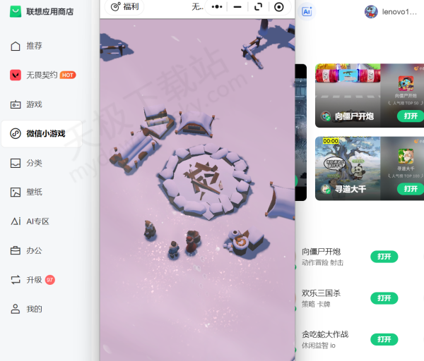 联想应用商店里的微信小游戏非常多,不仅能找到《无尽冬日》《开心消消乐》《向僵尸开炮》这类热门作品,还覆盖了休闲、解压、跑酷、解谜、棋牌等多种类型,无论是想短时间玩一局过过瘾,还是想沉浸式挑战关卡,都能满足需求。