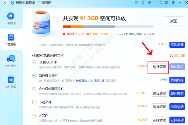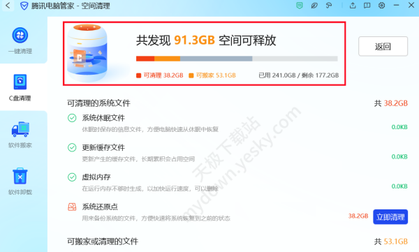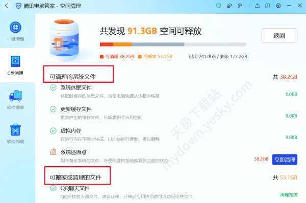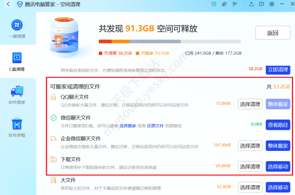 答:经实际测试验证,腾讯电脑管家的C盘清理效果极好,它会经过扫描给出C盘清理或释放的建议,可根据建议释放出较大的内存空间,例如清理掉聊天文件、系统缓存文件以及迁移日常下载的文件等”。强烈推荐大家安装使用,感受并体验其清理效果。