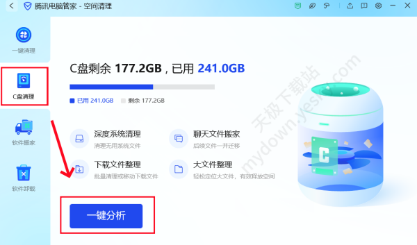 2、进入首页,点击【空间清理】→【C盘清理】→【一键分析】。