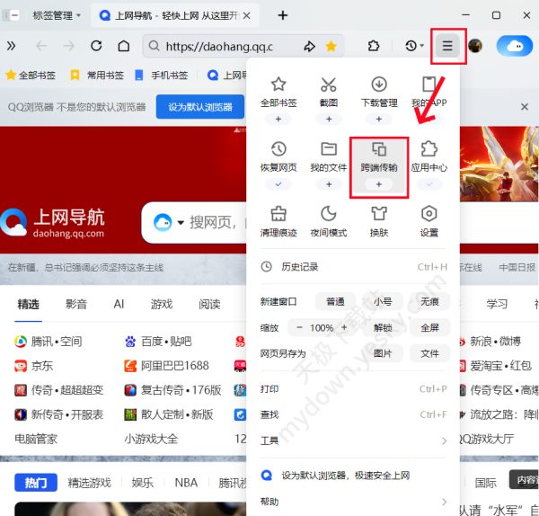 2、进入首页,点击首页右上角【☰】符号→【跨端传输】。