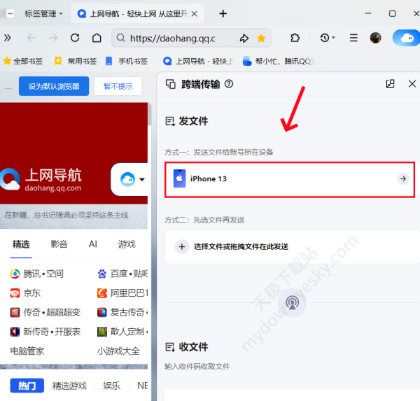 方法一:直接发送文件给账号所在的手机设备,选择需要传输的设备,再上传文件即可。