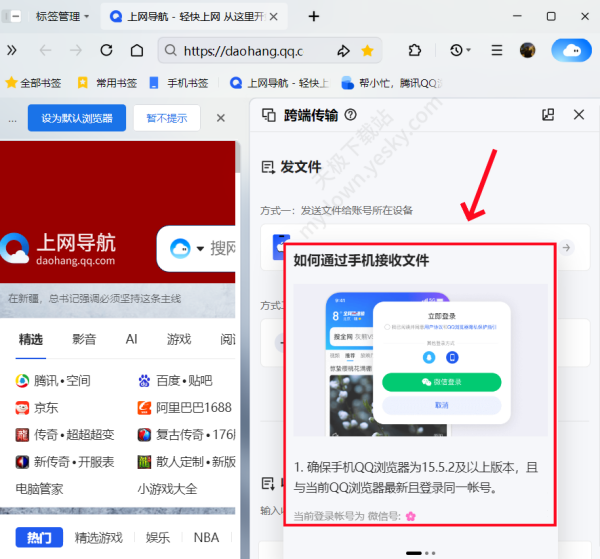 答:经实际测试验证,QQ浏览器跨端传输必须保证电脑端和手机端登录同一个账号,并且QQ浏览器为V15.5.2及以上版本才能进行传输。