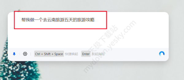 4、用户可以快捷键【Ctrl+Shift+Space】直接唤起桌面搜索,或开启【在任务栏显示桌面搜索入口】。输入:“帮我做一个去云南旅游五天的旅游攻略”。