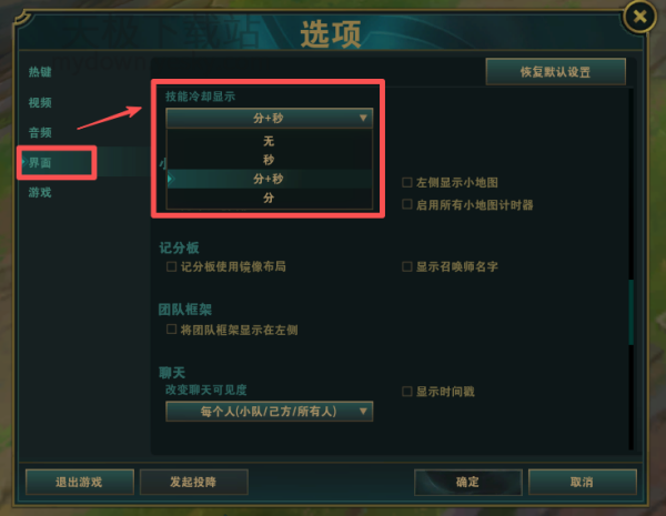 2.然后我们点击【ESC】键位,点击【界面】,在右侧找到【技能冷却显示】,然后进行更换,目前最好用的是“分+秒”。
