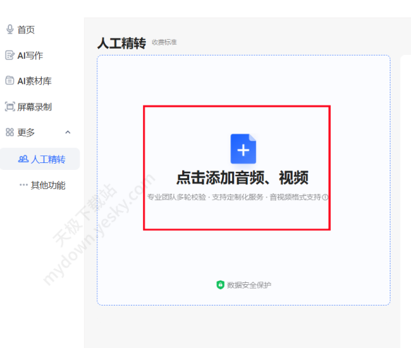 2、进入【人工精转】界面,点击添加音频、视频并上传自己想要转写的视频。