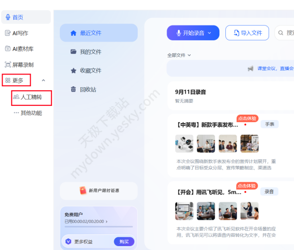 1、下载后打开讯飞听见,进入首页,点击左侧工具栏【更多】→【人工精转】。
