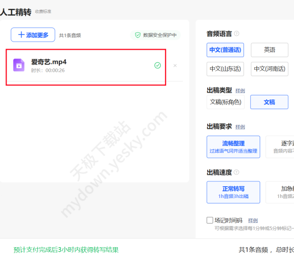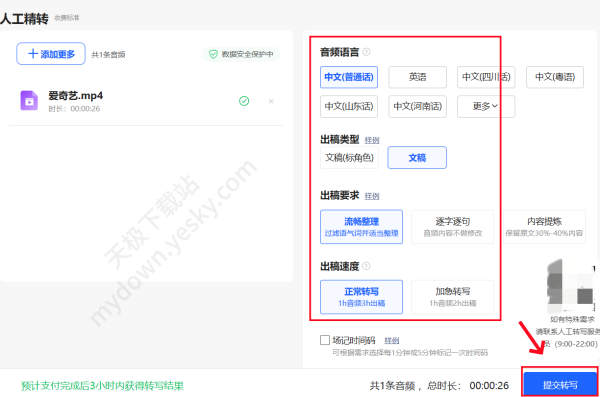 3、上传好视频后,在右侧选择【音频语言】、【出稿类型】、【出稿要求】、【出稿速度】最后提交转写支付价格即可。