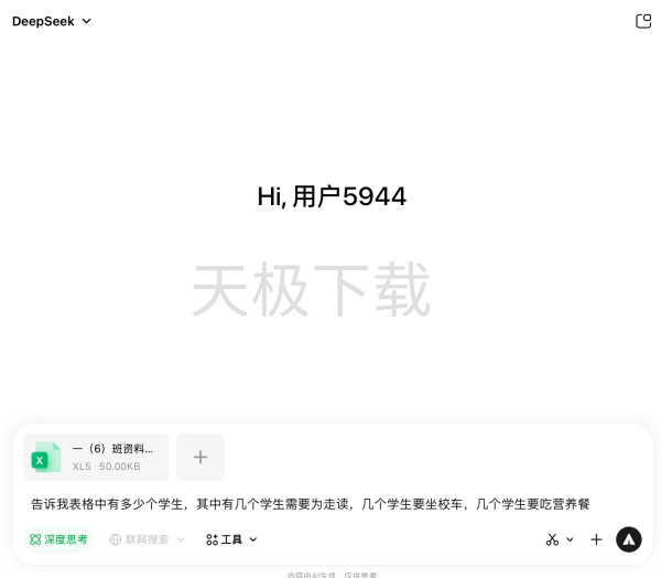 1.将Excel拖入聊天框,并输入需求,例如:告诉我表格中有多少个学生,其中有几个学生需要为走读,几个学生要坐校车,几个学生要吃营养餐。输入后按回车键发送。