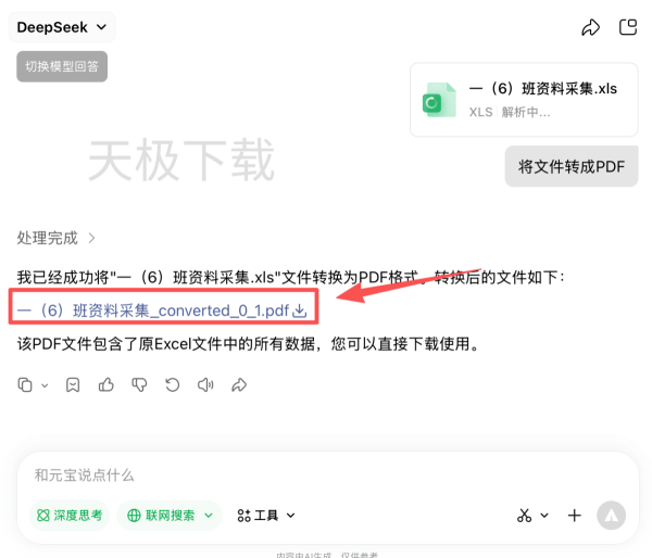 腾讯元宝支持将Excel文件转成PDF文件,只要上传Excel文件,输入指令:将文件转成PDF,即可得到PDF文件。