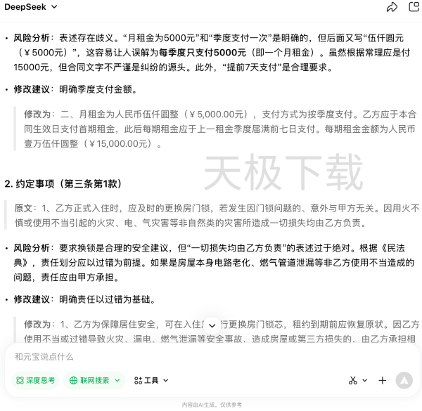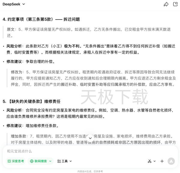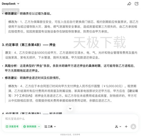 3.等待片刻,腾讯元宝就会根据合同内容,指出合同存在的问题,并提出修改建议,帮助用户快速识别合同陷阱。