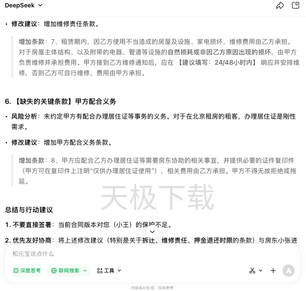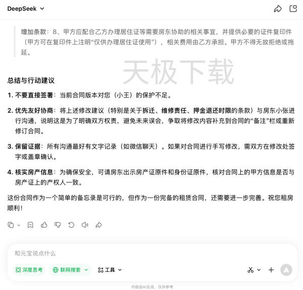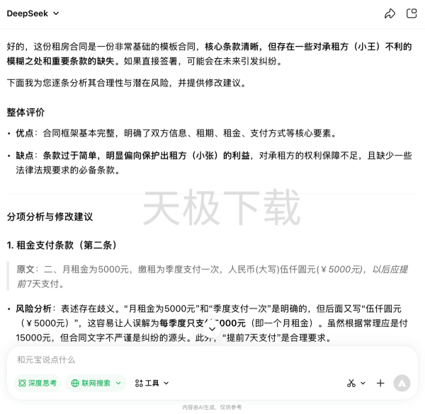 作为一款基于AI大模型的AI软件,腾讯元宝具备识别租房合同漏洞的能力,用户在无法识别合同是否存在漏洞时,可以让腾讯元宝帮忙看看合同的合理性,提升租房安全,具体操作如下: