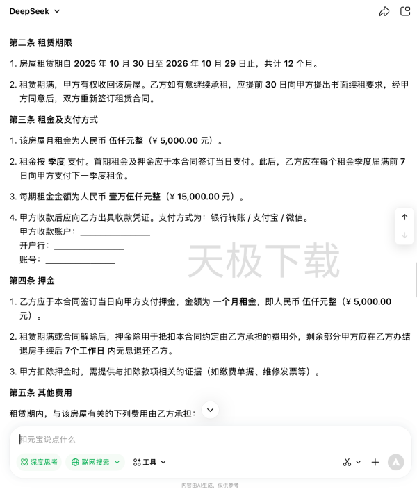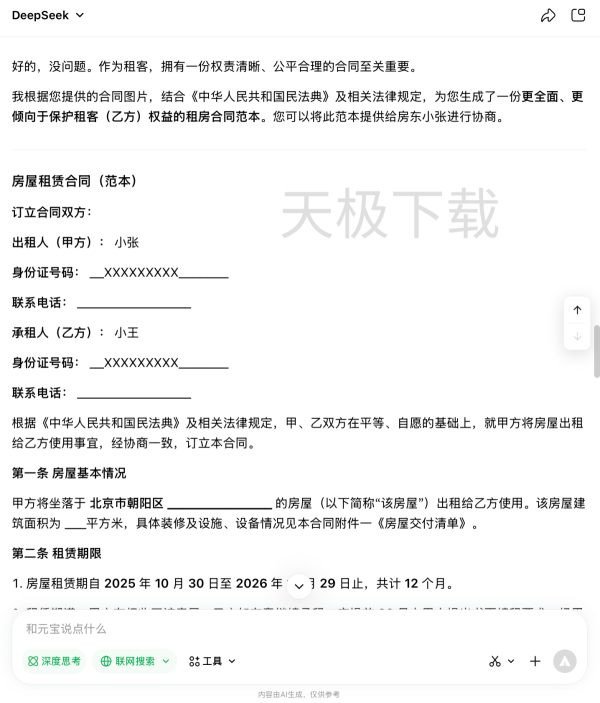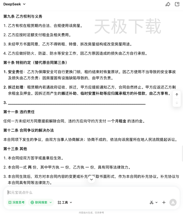 1.打开腾讯元宝,输入指令:我是租客,帮我生成一份合格且符合租客权益的租房合同。