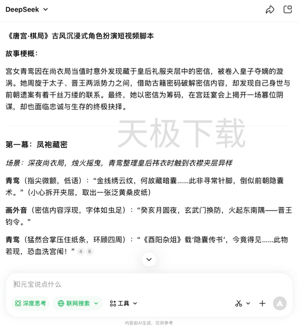 参考案例:以唐朝为背景,设定宫廷权谋剧情,讲述一位宫女卷入皇位争夺的故事,创作古风沉浸式角色扮演短视频脚本,台词设置注意文言用词。