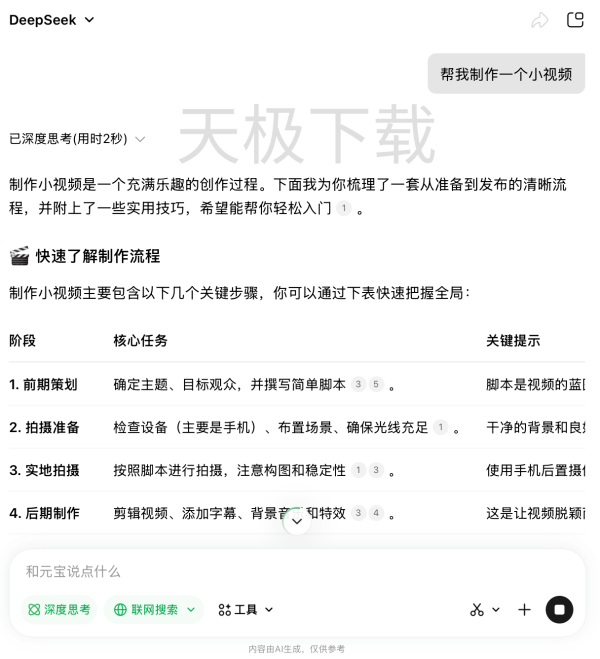 目前腾讯元宝电脑版暂不支持直接输出视频,用户只能生成视频脚本来辅助视频制作。