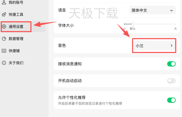 2.在弹出的对话框中,选择【通用设置】,点击【音色】一栏。