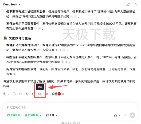 腾讯元宝支持AI读出答案,只要点击答案最后的【朗读】按键,即可让腾讯元宝读出答案。