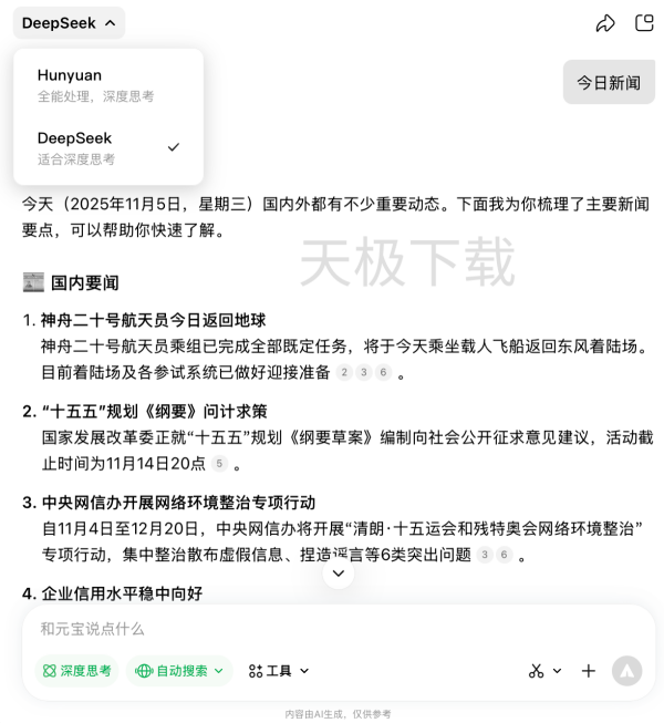腾讯元宝目前支持DeepSeek和Hunyuan两种大模型,两种大模型在语言处理能力以及侧重方面存在显著的差异,具体差异如下: