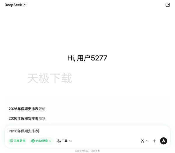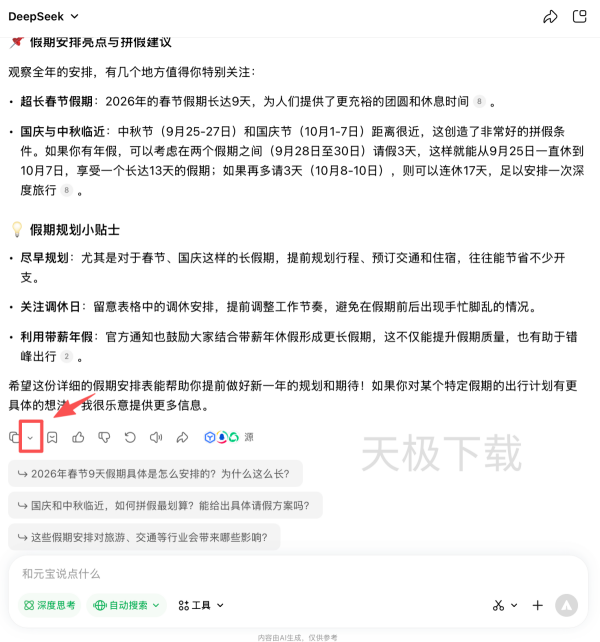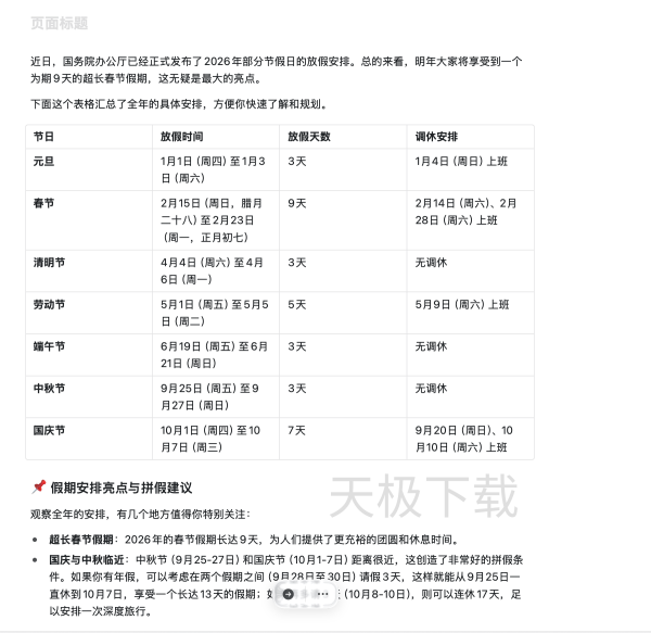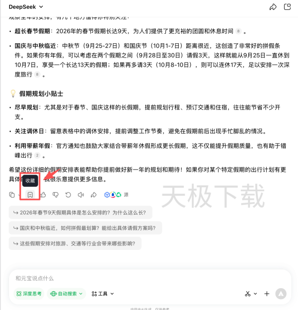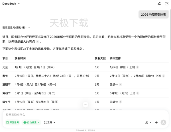 1.打开腾讯元宝,输入需要生成的指令,例如:2026年假期安排表。