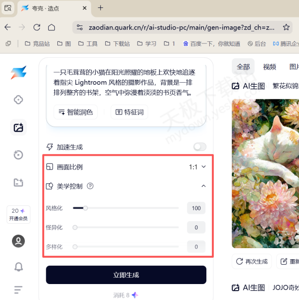 4.在下方调整画面比例、美学控制等选项,然后点击【立即生成】即可。