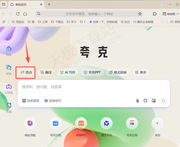 1.下载并打开最新版本的夸克浏览器,点击首页左上方【造点】。