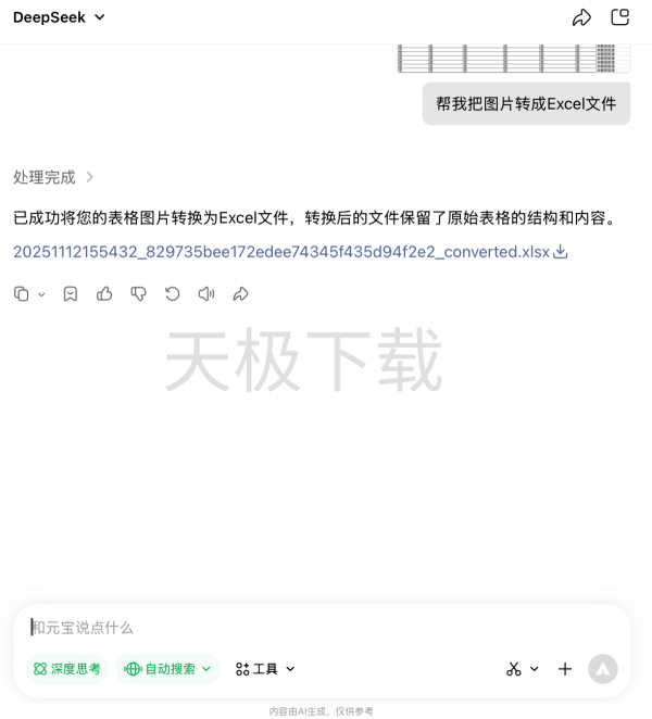 3.稍等片刻,腾讯元宝就会将图片转换成Excel文件,用户点击链接即可下载。
