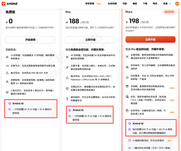 经调查,XMind一键生成思维导图是需要付费使用的,不过每位注册用户都能获得50次免费的AI功能体验机会,免费次数用完后,需升级为Pro+版本才能继续使用,Pro+版本用户每月可享受500次AI功能体验次数,满足高频使用需求。