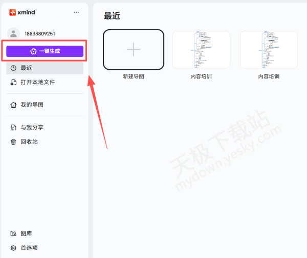 1.下载并打开最新版本的XMind,登录账号后,点击左上角【一键生成】。