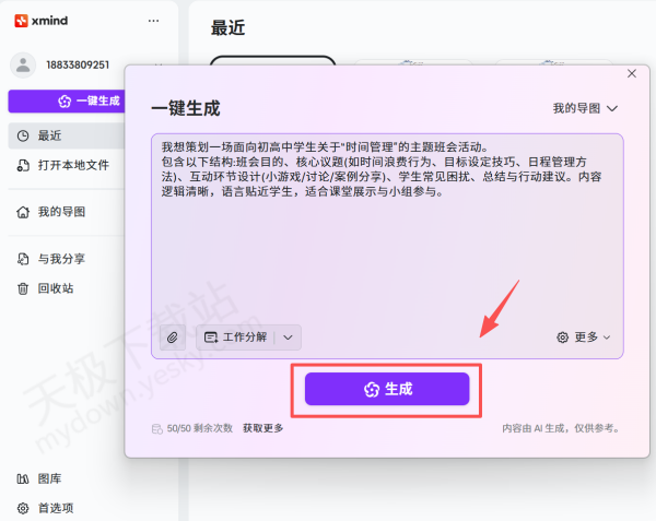 2.在上方输入思维导图的应用场景主题,补充思维导图应该具备的内容,然后点击【一键生成】。