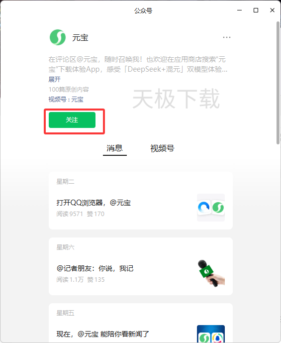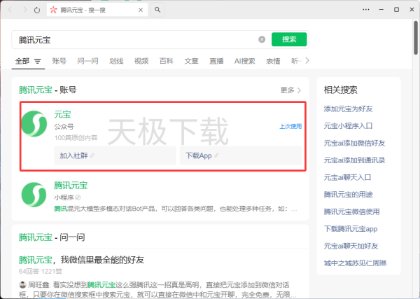 2.在搜索结果页面点击【元宝公众号】。