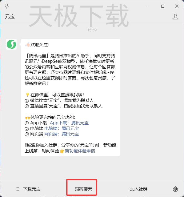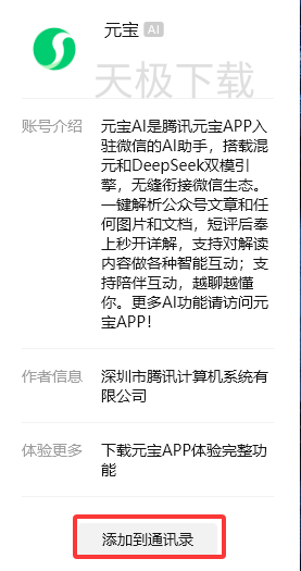 腾讯元宝可以添加为微信好友,用户添加后可直接通过聊天窗口与元宝进行智能对话,支持文件解析、文案生成、多模态交互等功能。具体添加操作如下: