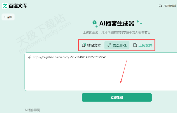 3.可以直接复制文本,也可输入网址,添加文本文件,完成后点击【立即生成】即可。