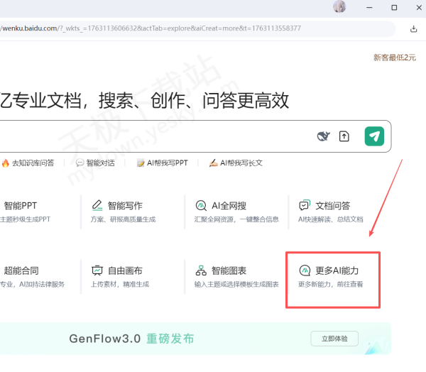 1.打开最新版本的百度文库,选择右下角【更多AI能力】。