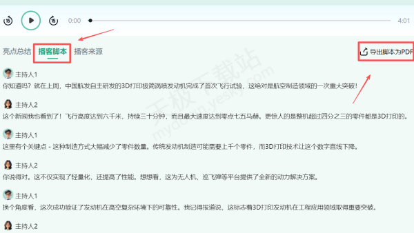 5.在【播客脚本】处,我们可以看到整段音频的文本内容,右侧可将其导出PDF。