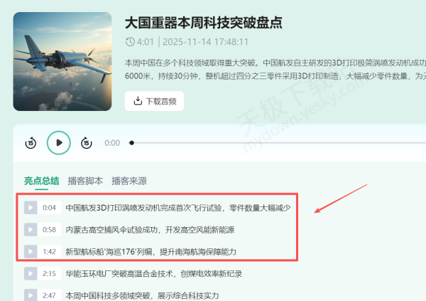 4.稍等片刻百度文库会根据我们输入的内容生成播客,在【亮点总结】处,可以看到具体每个时间段的总结。