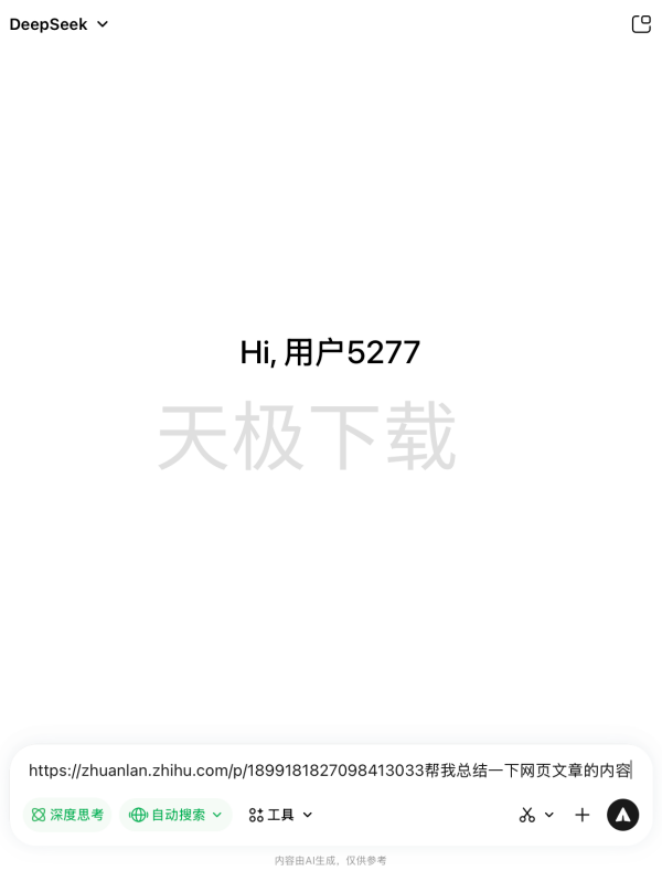 1.打开腾讯元宝,在对话框内粘贴需要解析的网页链接,并附上指令:帮我总结一下网页文章的内容。