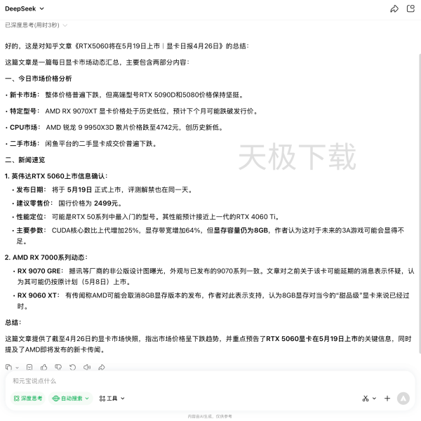 2.稍等片刻,腾讯元宝就会将网页内容进行总结,并以结构形式呈现,更加清晰明了。