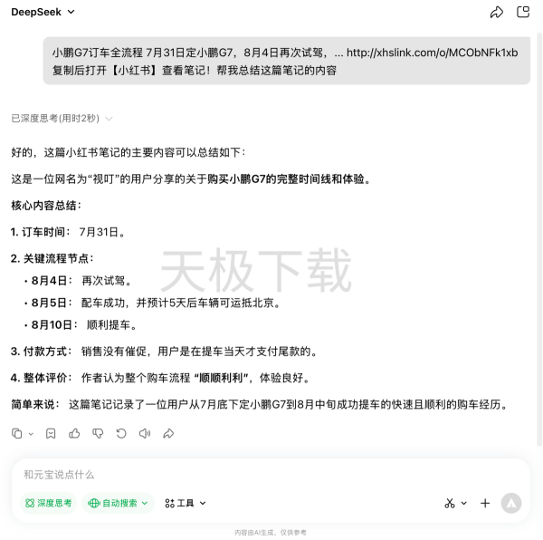 1.打开腾讯元宝,将小红书笔记的内容链接粘贴到对话框,并输入指令:帮我总结这篇笔记的内容。