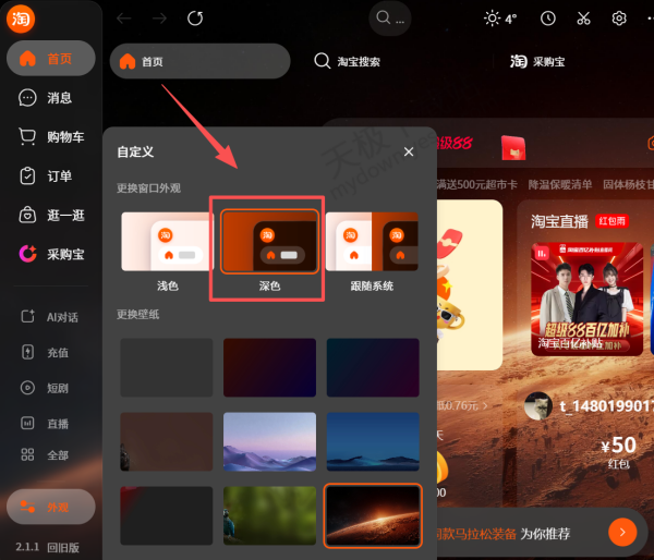 1.打开最新版本的淘宝桌面版,点击左下角【外观】,在右侧【更换壁纸】处可随意挑选。