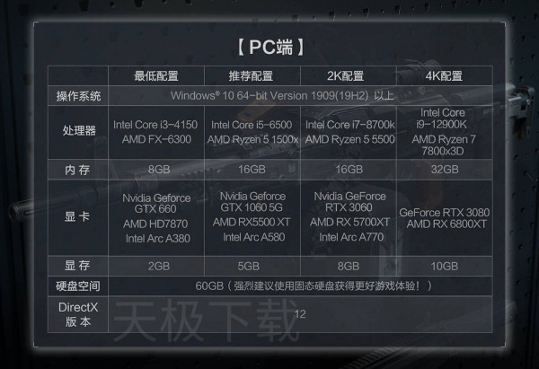 ●最低配置:GTX 660、8G内存,低配需降低画质