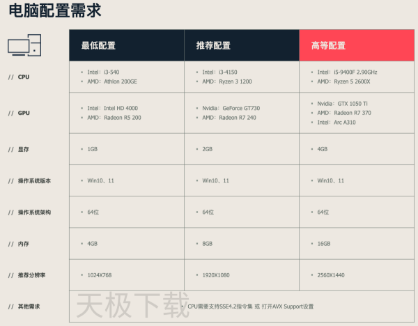 ●最低配置:核显/GTX 750Ti、4G内存,老旧笔记本可流畅运行