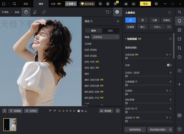 特色:功能齐全,覆盖调色、滤镜、抠图、证件照制作。AI一键美颜自然不假,磨皮、瘦脸、美白一步到位。