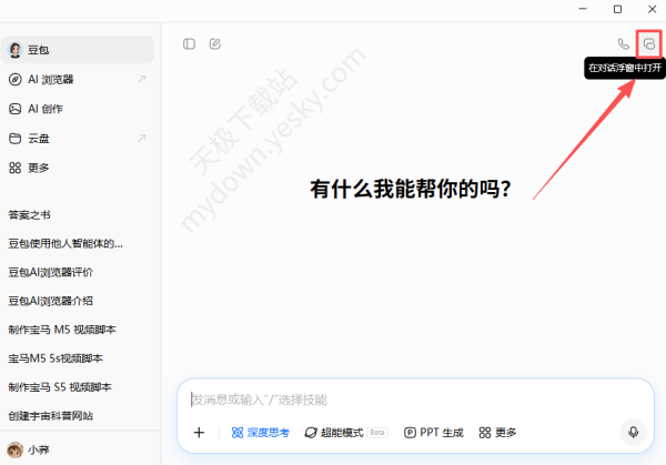 1、打开豆包最新电脑版,在右上角找到【在对话浮窗中打开】。