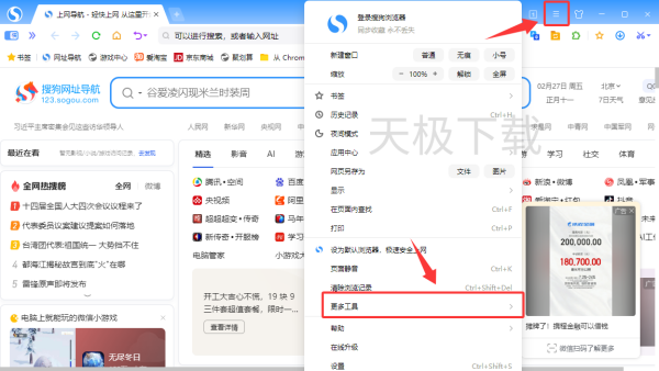 1.打开搜狗浏览器,点击右上角的【设置】,选择【更多工具】。