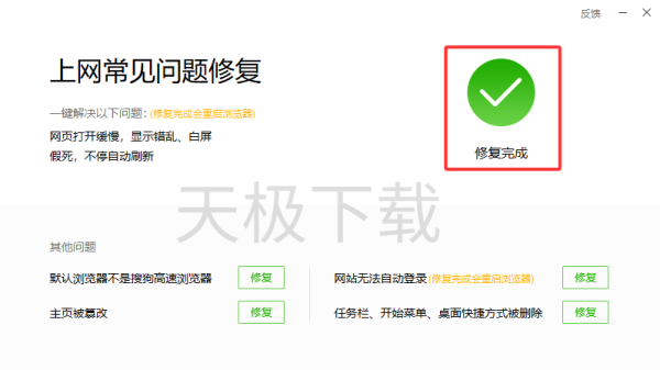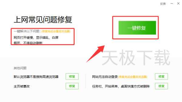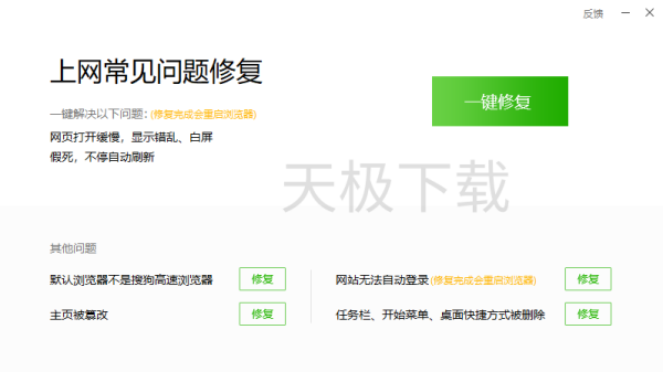 2.修复主页/搜索引擎被篡改、快捷方式劫持、界面布局错乱等配置异常问题。