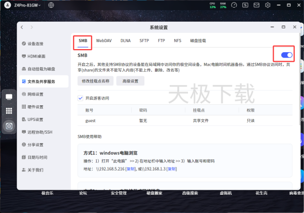 3.点击【SMB】,并切开启选项,即可成功启用极空间的SMB服务。