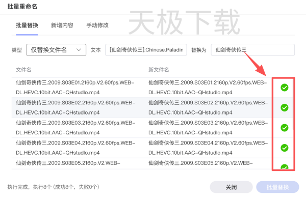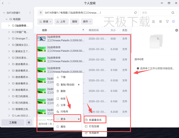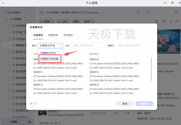 极空间原生支持批量替换文件后缀名,你只需在文件管理中选中目标文件,通过批量重命名功能,即可自定义设置新的文件扩展名,完成批量替换操作。同时还支持按指定后缀筛选文件,实现精准匹配处理。无需借助第三方工具,手机APP、电脑客户端均可操作,门槛低且能高效完成批量文件后缀的统一修改与替换。