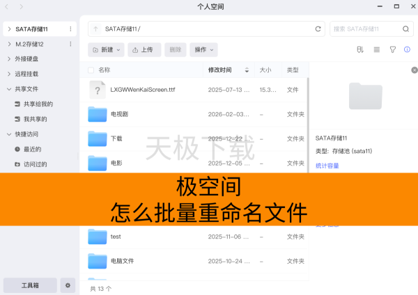 极空间的批量重命名功能无文件格式限制,可支持所有能被其系统识别管理的文件,无论是图片、视频、音频、文档、压缩包等任意后缀格式的文件,都能执行批量重命名操作。该功能核心是修改文件名与扩展名,不依赖文件本身的格式,仅需文件存储在其支持的FAT32、NTFS、Ext4等格式的存储介质中,同时文件名需符合系统命名规范。