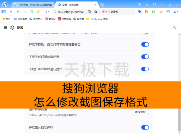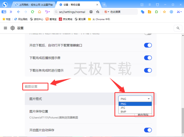 目前搜狗浏览器支持PNG、JPG以及BMP三种截图格式,用户可自行修改。