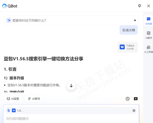 QQ浏览器在V19.2.5版本对智能助手Qbot的AI文档功能进行了升级,新增文档大纲总结功能,能够用户快速把握文档核心内容。下面,天极软件探索员为大家带来QQ浏览器AI文档大纲总结的详细图文教程。